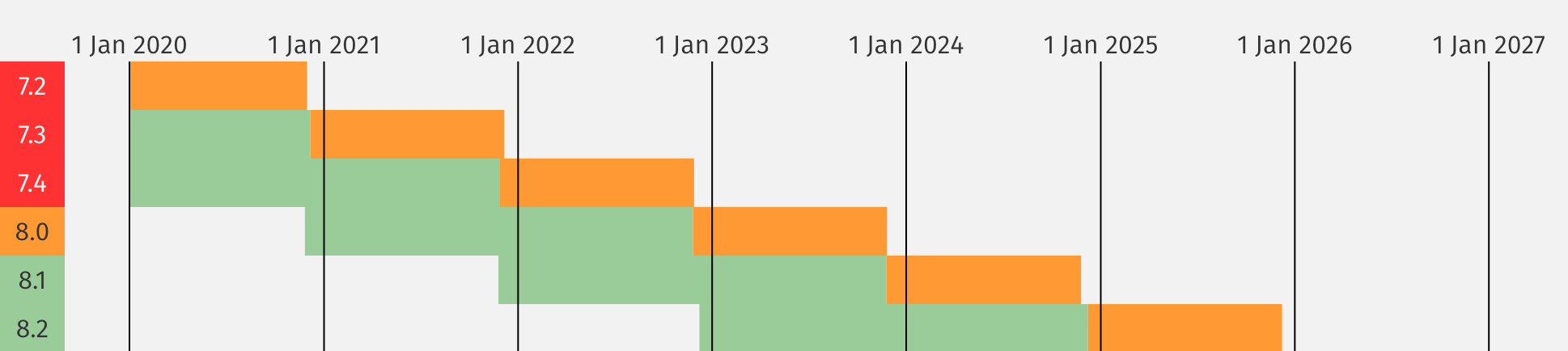 PHP 8.0 will reach its End of Life (EOL) and will no longer receive security updates after November 26, 2023. You can always check the release and support schedule at php.net/supported-versions.php: